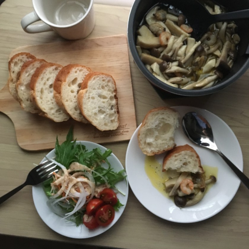 たっぷりきのこアヒージョとバゲットのお部屋ピクニック